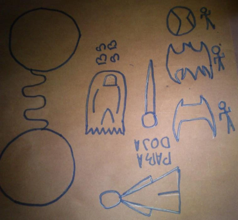 Bat Boy:Que esto? *Le Toma una Fotografia* Paradoja?,BSSB?,Estos Simbolos yo los Conosco el Primero Viene de un Simbolo de una Civilazacion Alienigena de Hace Millones de Años,El Segundo es mi Simbolo y el Tercero Parece una Maquina,Pero no tengo Idea de que Signifique lo demas y Esas 2 Esferas?,Esa Cosa Parece una Espada y esa Cosa Junto a las Esferas,Parece un Hombre con Capucha